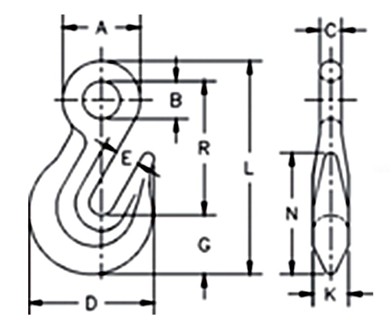 * Estos ganchos A-323 están forjados con un "8" que indica Grado 80 y son aptos para su uso con cadenas de Grado 8 en aplicaciones de elevación aérea, siempre que el gancho se someta a pruebas de resistencia como parte del conjunto de la eslinga de cadena o como componente individual según la norma ASME B30.9. Recomendamos el uso del gancho A-1328, que se somete a pruebas de resistencia y se suministra con un certificado de prueba.